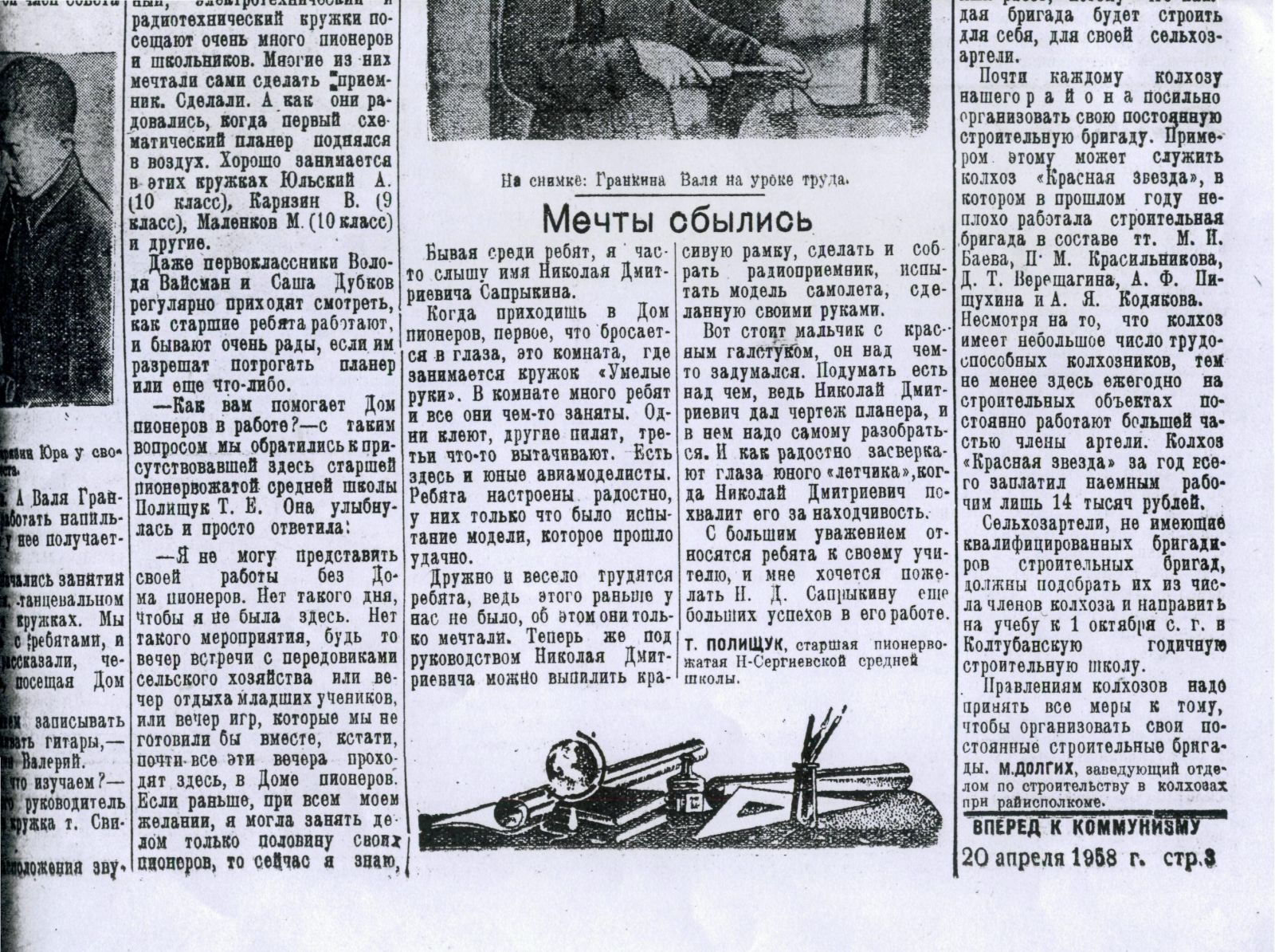 «Мечты сбылись» именно эта статья позволяет узнать значение Дома пионеров для детей и взрослых в далекий 1958 год.Электротехнический и радиотехнический кружки стали самыми популярными у мальчишек тех лет, а еще каждый из них мечтал быть первым конструктором собственного планера, занимаясь в кружке юного авиамоделиста под руководством Сапрыкина Николая Дмитриевича. А девочки с удовольствием учились вязать на занятиях кружка «Рукоделие». Из слов старшей пионервожатой средней школы Полищук Т. Е. можно узнать о том, что Дом пионеров стал неотъемлемой частью работы со школьниками, так как встречи с передовиками сельского хозяйства, вечера игр и отдыха проходят именно здесь при непосредственном участии и помощи педагогического коллектива Дома пионеров. Но, на критическую статью в газете «Вперед к коммунизму» за 21 апреля 1958 года директора Дома пионеров Саморукова Н.М отвечает статьей «Улучшим работу с пионерами». А еще самых лучших пионеров награждали бесплатными путевками в загородный лагерь «Орленок», находящийся на территории Новосергиевского района, где дети с удовольствием отдыхали и набирались сил. Новой формой работы с детьми стало проведение районных конференций юных следопытов и краеведов. Сюда в районный Дом пионеров и школьников в 1962 году приезжали представители 10 школ района, работавших по пяти направлениям: «Идеи Ленина живут и побеждают», «В боях отстояли Отчизну свою», «В буднях великих строек», «К тайнам природы», «Искусство принадлежит народу». По итогам конференции 55 учащихся были награждены памятными призами и почетными грамотами.